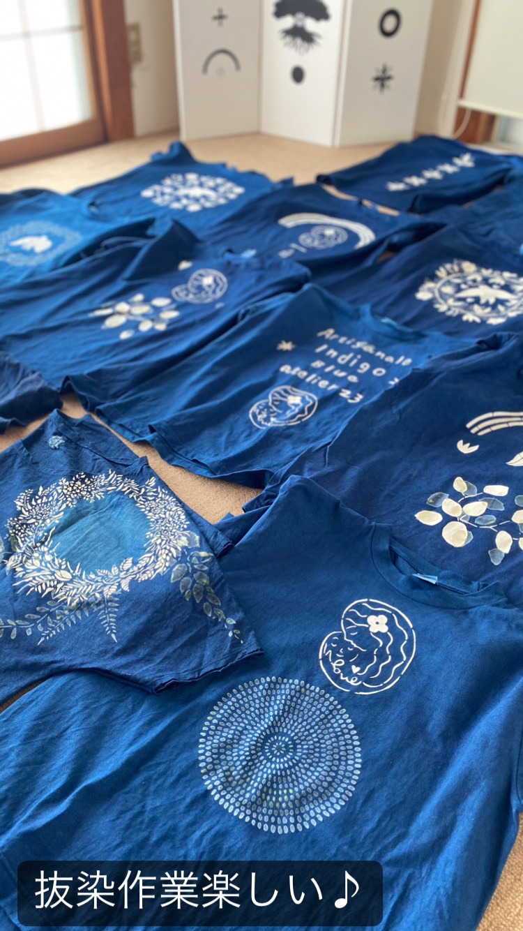 一枚一枚閃きで抜染した一点モノを中心に、表意文字の詩を書にしたためた作品が並びます